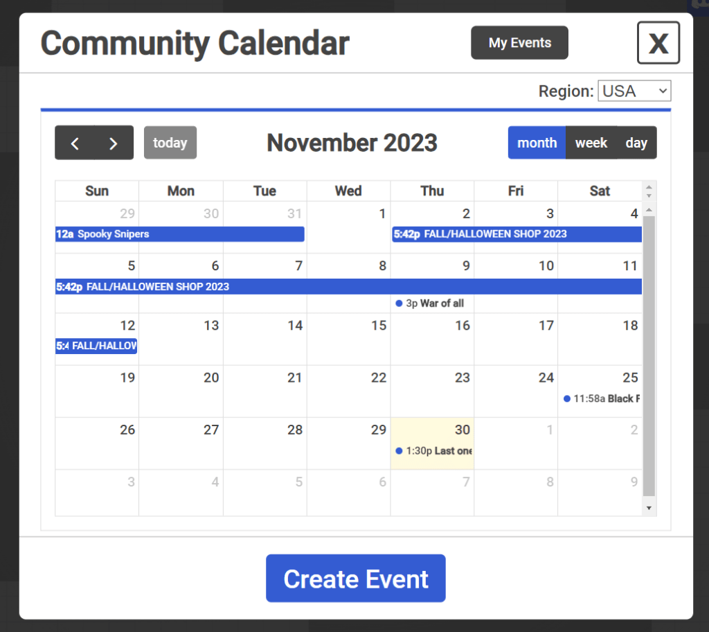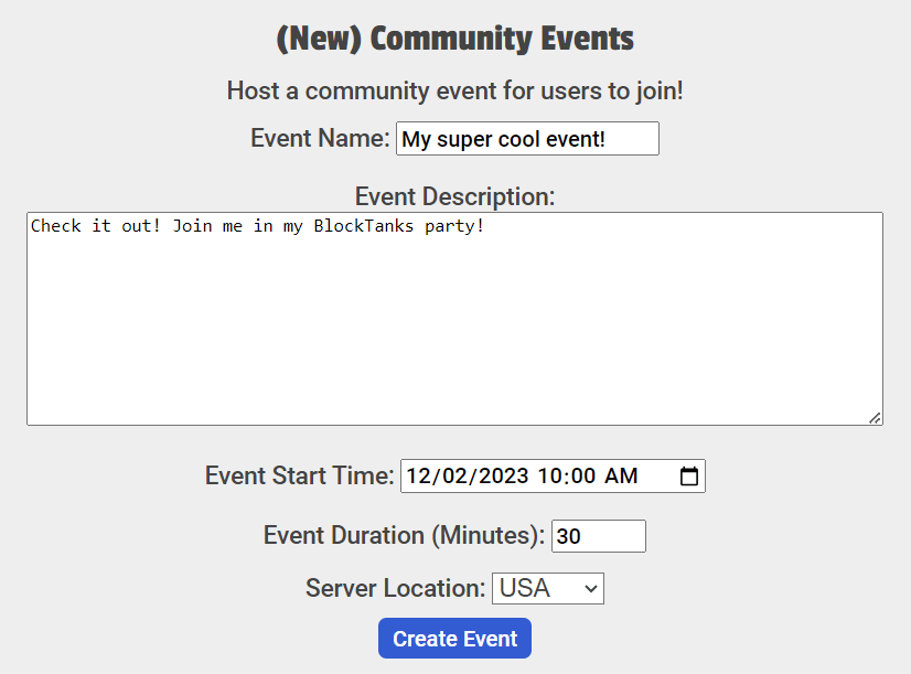 One of our top priorities in BlockTanks is allowing players to create content for the game itself. For example, anyone can create their own maps and clans, and many of our skins are made by community members too. Today, we add a new type of content to the list: scheduled events on our community calendar!