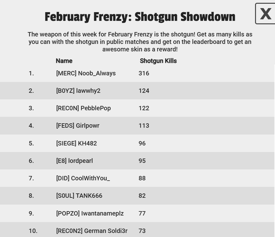 Week 1 – Shotgun Showdown: The first week, lasting until the 8th, will be all about shotguns. Try and catch your opponents with the shotgun at close range to get 50 shotgun kills!
